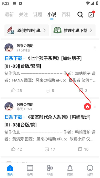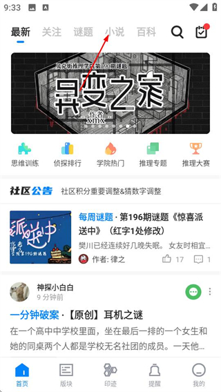 1、在贝克街推理学院首页,点击顶部的小说选项,进入小说板块页面。