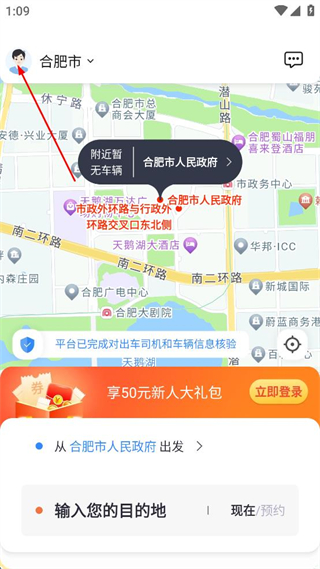 3、登录后返回主界面,确认出发地为合肥市人民政府,点击输入目的地栏。