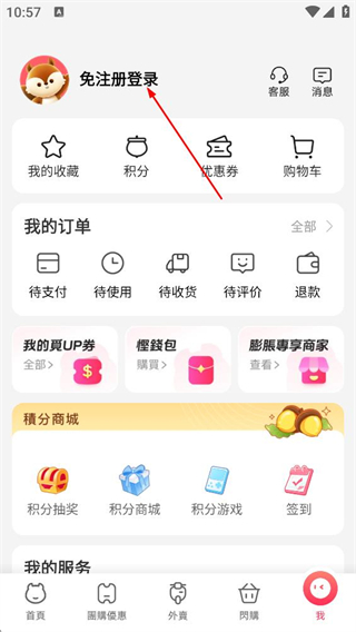 2、在个人页面,点击上方的免注册登录选项,进入欢迎登录澳觅界面。