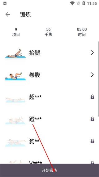 3、在锻炼项目页面,点击开始锻炼,进入锻炼界面。