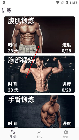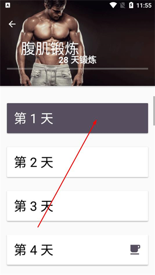 1、在魔力腹肌速成的训练页面,选择腹肌锻炼项目,进入28天锻炼计划页面。