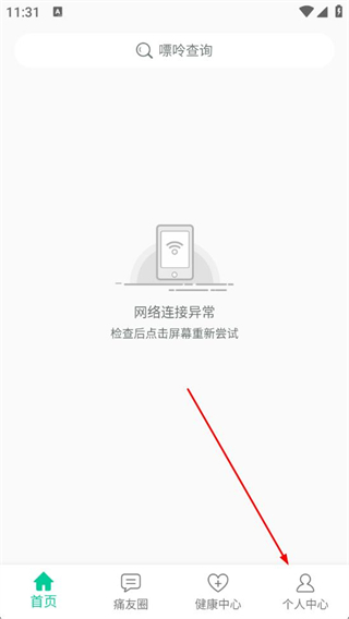 1、在别痛风app的首页,点击底部个人中心选项,进入个人中心页面。