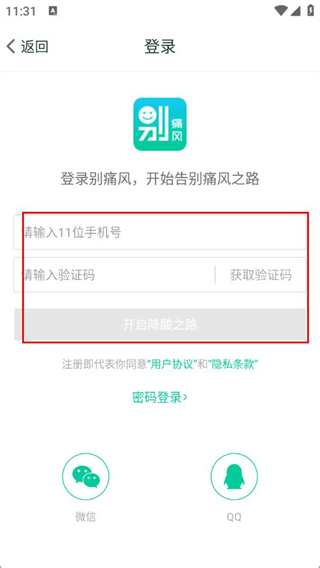 3、输入1手机号和收到的验证码,完成后点击开启降酸之路即可登录。