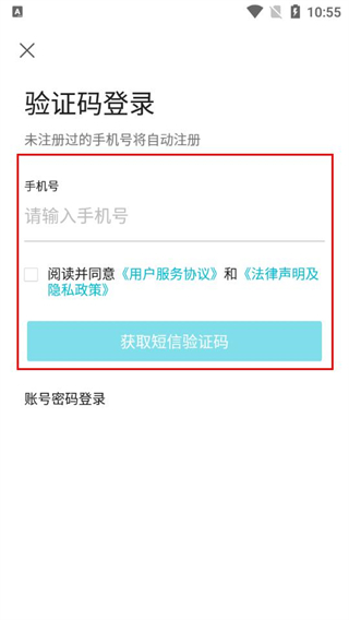 2、在验证码登录页面输入手机号,勾选协议后点击获取短信验证码。