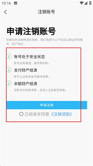 4、在注销账号页面,确认账号状态并勾选协议后,点击申请注销完成账号注销流程。