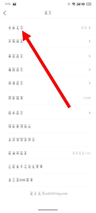 3、在设置页面,点击选择字体大小,进入字体调整页面。