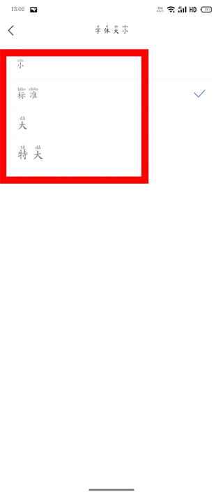 4、在字体大小页面,选择好字号,完成阅读字体的调整。