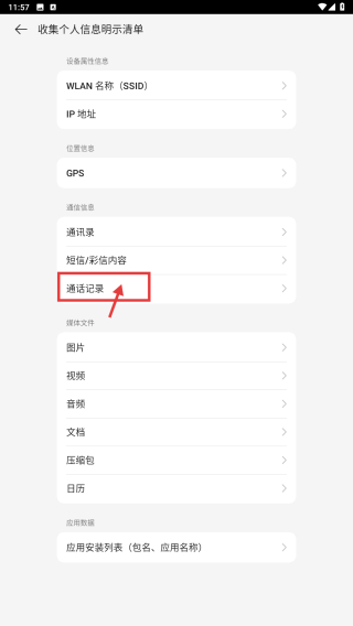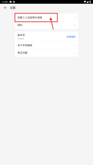 2、在设置页面,点击收集个人信息明示清单选项,进入信息清单页面。