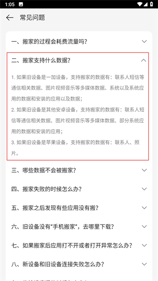 可全面转移旧机中的联系人、信息、照片、通话记录等基础数据,还能迁移已安装应用及微信、QQ等社交平台聊天记录,覆盖几乎所有数据类型。