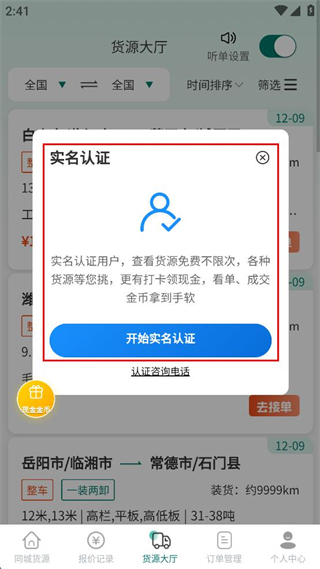 4、进入货源大厅页面,弹出实名认证提示框,可点击开始实名认证完成操作。