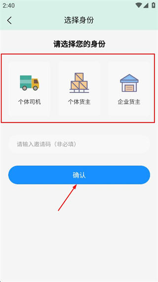 3、登录后进入选择身份页面,挑选对应的身份选项,可输入邀请码后点确认。