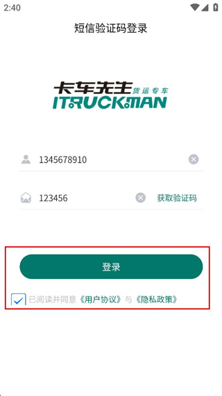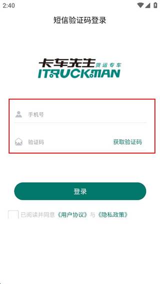 1、打开卡车先生应用,进入短信验证码登录页面,输入对应的手机号码。