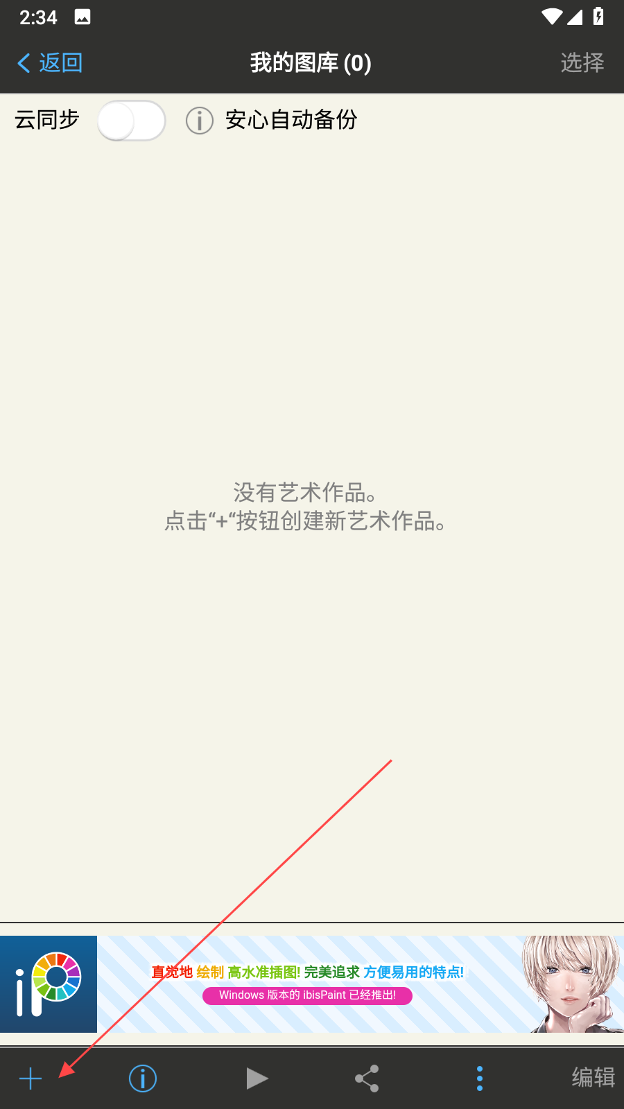 2、在我的图库界面,若没有作品会提示点击+按钮创建新艺术作品,点击底部+按钮,进入新建界面。