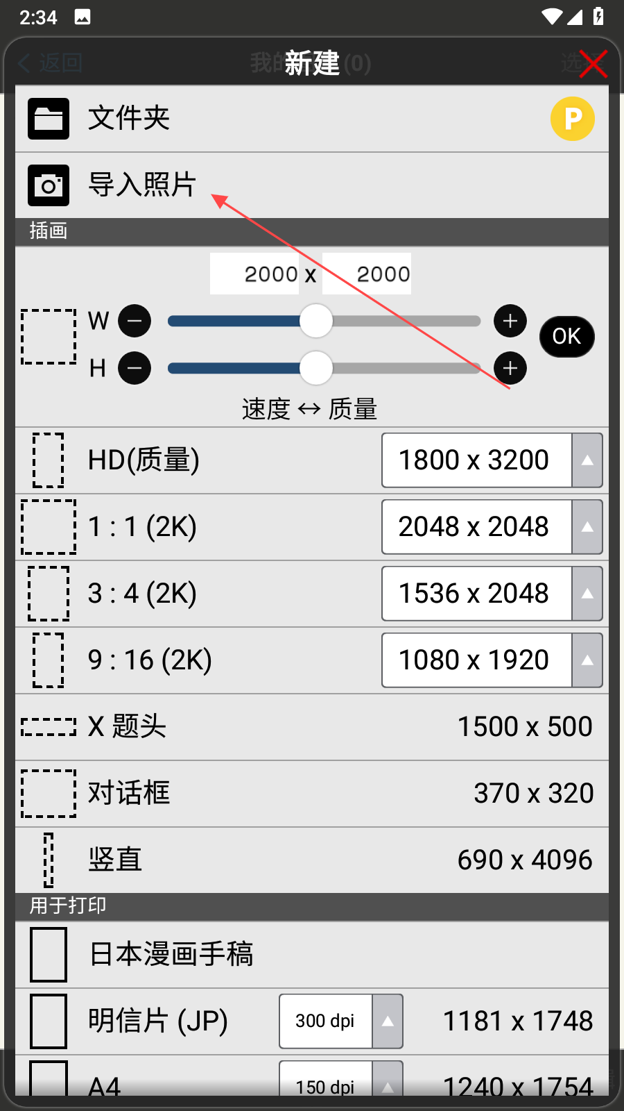 3、在新建界面中,点击导入照片选项,此时应用会请求获取访问相册的权限,按提示允许后,便可从手机相册里选择想要导入的图片,选中后确认导入。