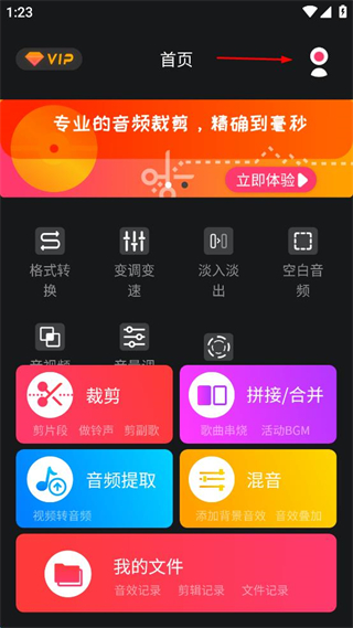 1、打开音频剪辑应用,点击界面右上角的个人图标,进入尊贵VIP页面。