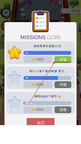 3、通过接待观众、优化设施积累金币,同时推进任务进度条。