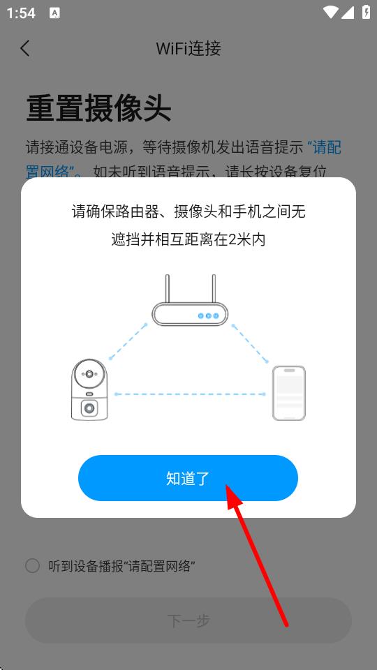 4、若选择WiFi连接,按提示接通设备电源,等待摄像机发出“请配置网络”的语音提示,点击知道了,然后按后续提示完成连接。