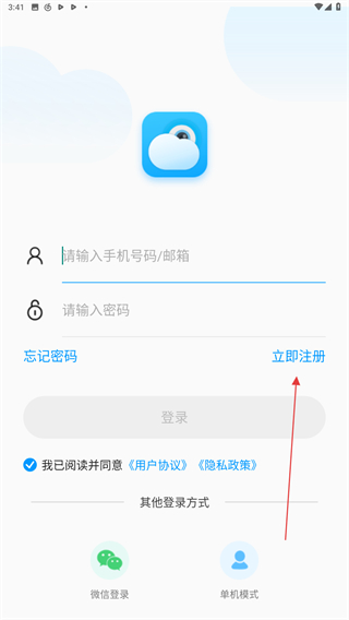 1、启动乔安智联监控APP,进入时点击右侧立即注册的按钮。