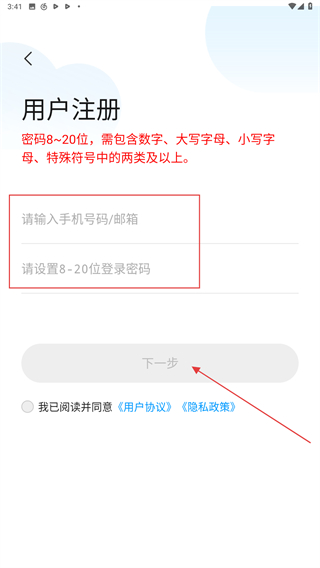 2、进入用户注册的界面内,输入手机号、密码,再点击下一步。