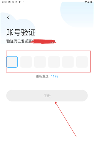 3、在账号验证的界面内,输入验证码后再点击注册按钮即可。