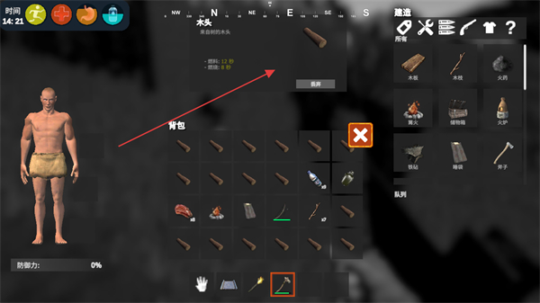 2、打开背包界面,查看已收集的资源如木头、工具,管理物资库存。