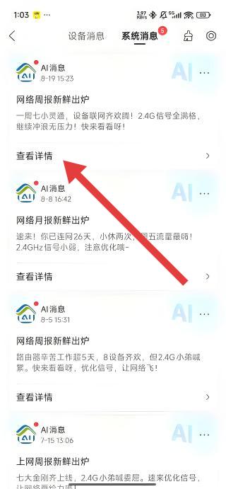 2、在消息列表中,找到网络周报新鲜出炉类信息,点击其下查看详情按钮,进入网络报告页面。