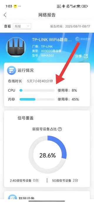 3、进入网络报告页面,可查看TP-LINK-WiFi6路由器的在线时长、CPU及内存使用率等具体运行数据。