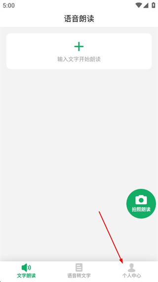 1、打开语音朗读软件的文字朗读页面,找到下方的个人中心选项,点击进入个人中心页面。