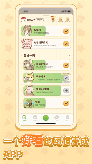 习惯大作战软件是一款画风可爱的习惯打卡软件,可以根据自己长期的不良习惯创建一些打卡的任务,争取在短时间内能够让自己养成良好的生活习惯,软件还能根据用户的情况做出提醒,避免出现忘记的情况出现,同时可爱的外观也让能增加用户对于软件的乐趣,提高自己的执行力。