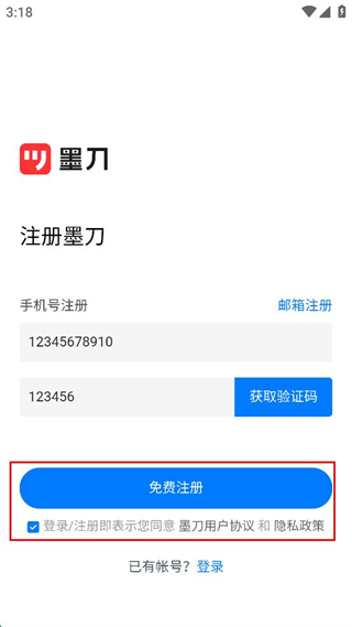 1、打开墨刀应用,在登录页面点击注册选项,进入注册墨刀的操作界面。