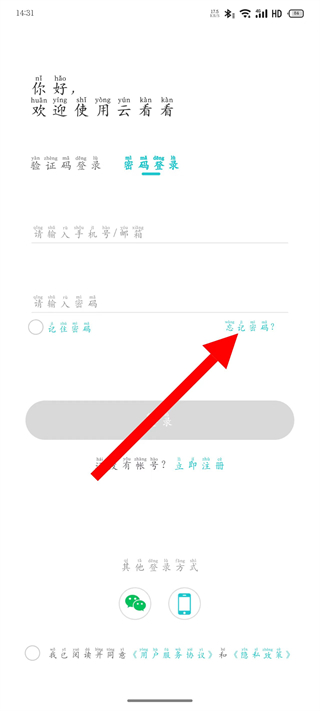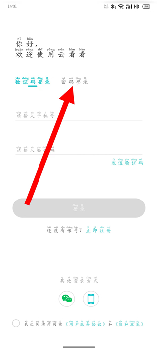 1、打开云看看登录界面,点击密码登录,切换到密码登录页面。