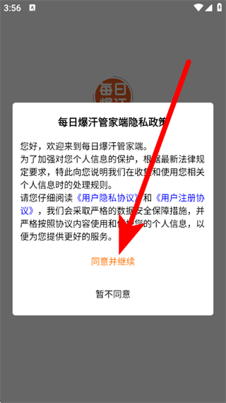 1、打开每日爆汗管家,在隐私政策弹窗中,点击同意并继续。