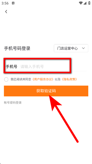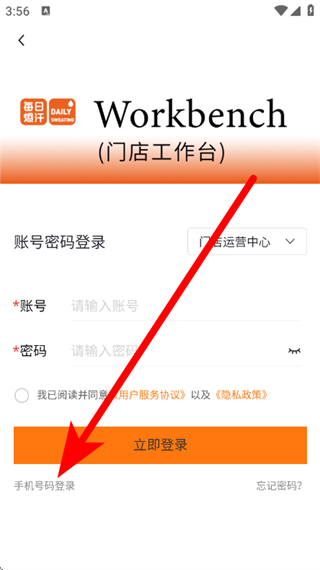 2、在门店工作台登录页面,点击手机号码登录,进入登录页面。