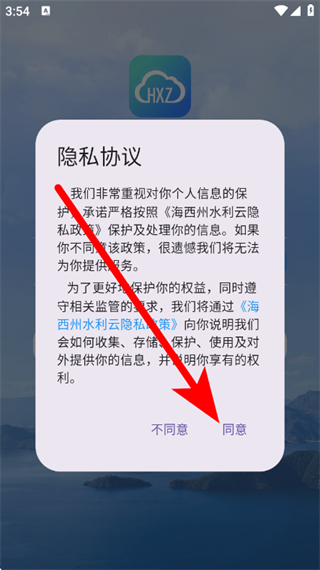 1、打开海西州水利云,在隐私协议提示框,点击同意,进入登录界面。