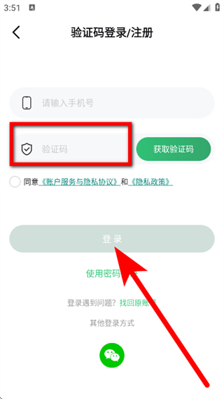 2、在登录界面,点击使用验证码登录注册,进入登录注册页面。