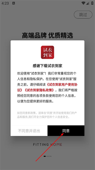 1、在试衣到家的服务协议弹窗中,点击同意,进入应用页面。