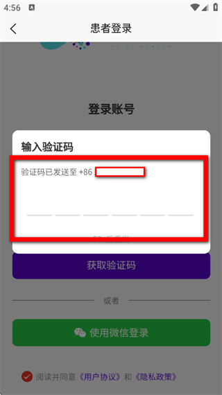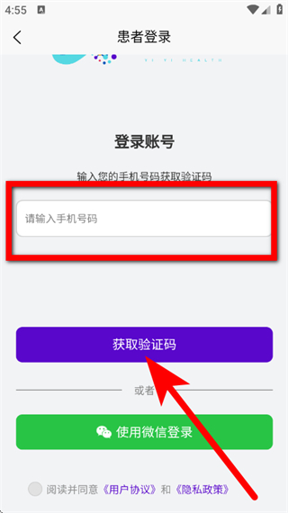 3、在登录页面,输入手机号码,勾选协议后,点击获取验证码。
