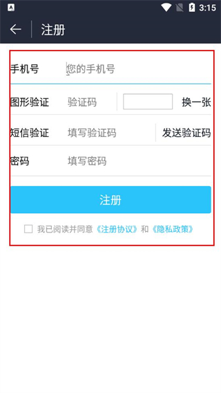 3、填写手机号、图形验证码、短信验证码、密码,勾选协议,点击注册。