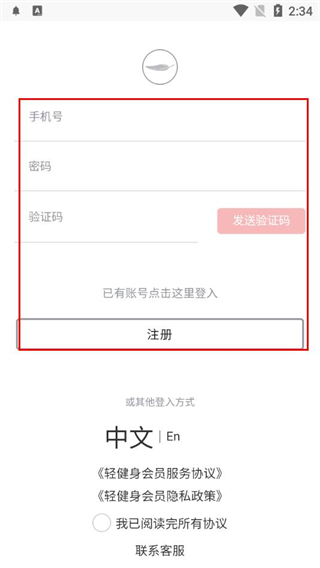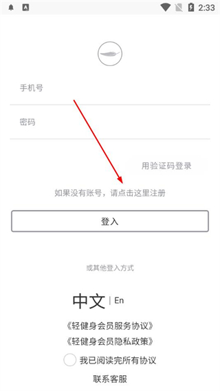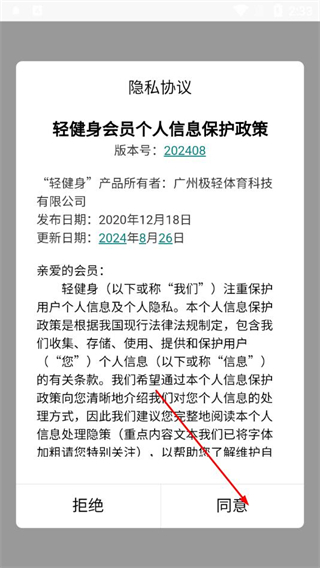 1、在轻健身app的注册/登录页面,弹出隐私协议窗口后点击同意。