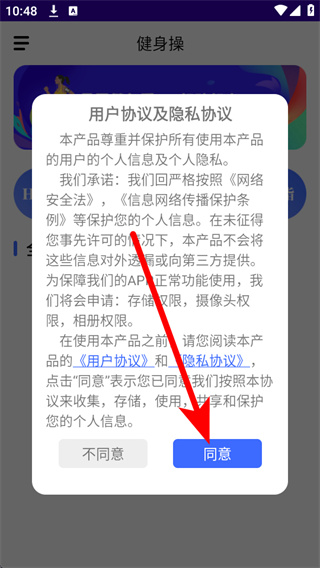 1、打开减肥操APP,在弹出的弹窗中点击同意,进入应用主页。