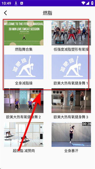 3、在分类列表中,选择想要练习的健身操内容,点击进入该内容的播放列表页面。