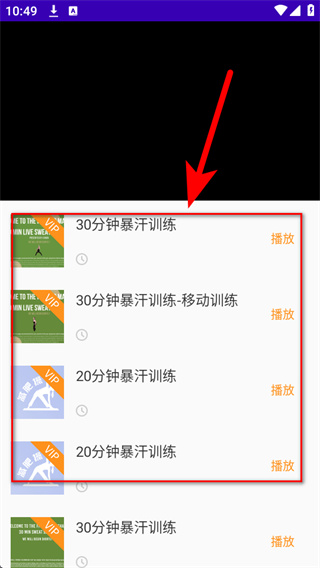 4、在播放列表中,选择具体的训练视频,点击右侧的播放,即可开始跟随视频练习减肥操。
