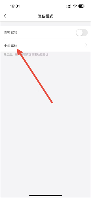 4、在隐私模式页面,点击手势密码选项,进入设置手势密码操作。