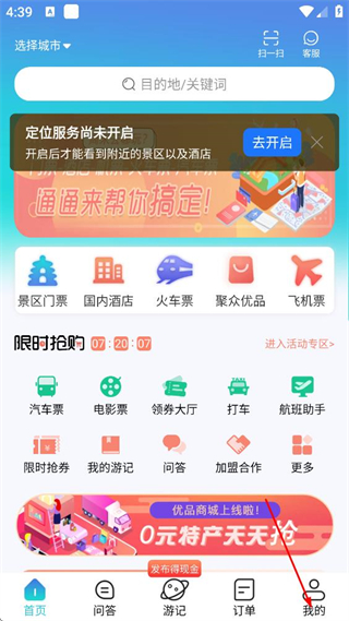 1、在快票出行首页,点击底部我的,进入个人中心页面。