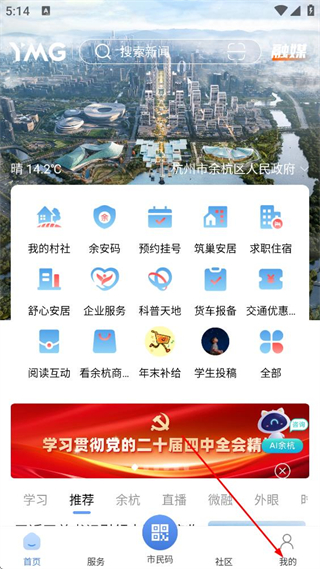 1、在看余杭APP的首页,点击底部我的,进入登录相关的页面。
