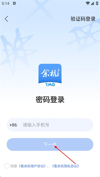3、在密码登录界面,填写手机号后,点击下一步,进入密码设置页面。