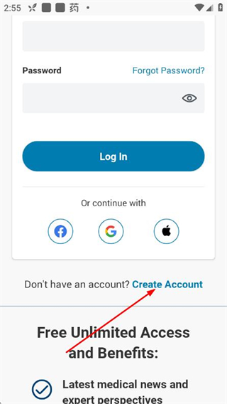1、打开Medscape登录页面,点击Don't have an account? Create Account选项,进入注册界面。