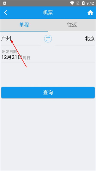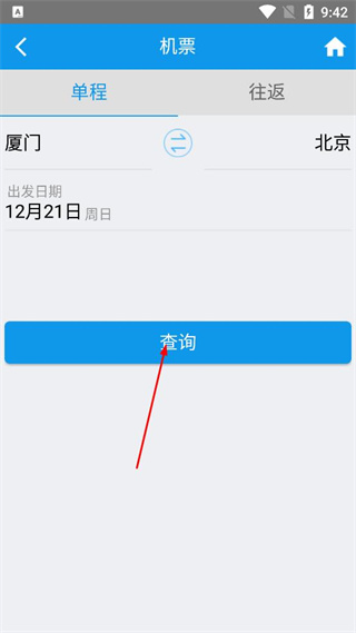 3、返回机票页面确认出发地和目的地,再点击下方的查询按钮。