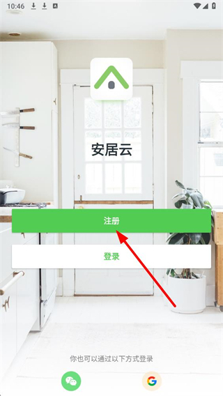 1、在安居云app的初始界面,点击绿色的注册按钮,进入账号注册的操作页面。