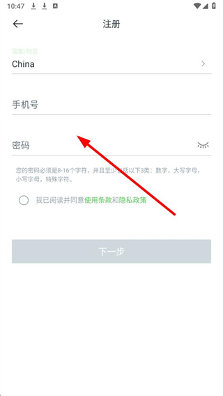 2、进入注册页面后,输入手机号,并按要求设置密码,点击下一步。